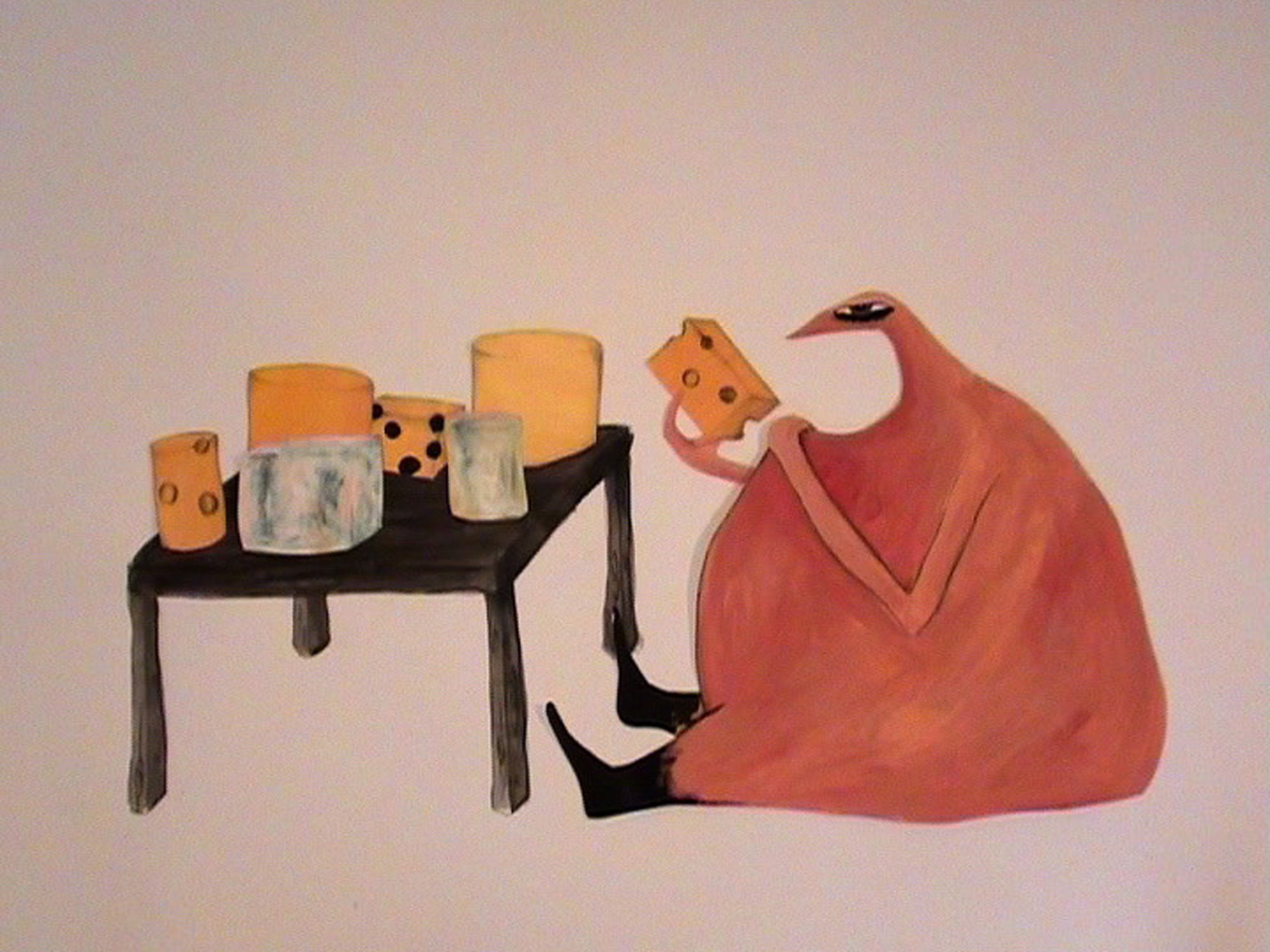 Video clip and still images from the animation CHEESE. Stop motion animation. 9:10 min. Video and sound: Sigga Björg Sigurðardóttir. 2009. (Cheese is a film about a mysterious and sensitive Cheese that becomes possessed when he comes across a freelance oracle. Cheese is a complex character that is a quiet introvert who, for instance, goes to see an abstract cinema but also has a twisted darkness in his nature.)