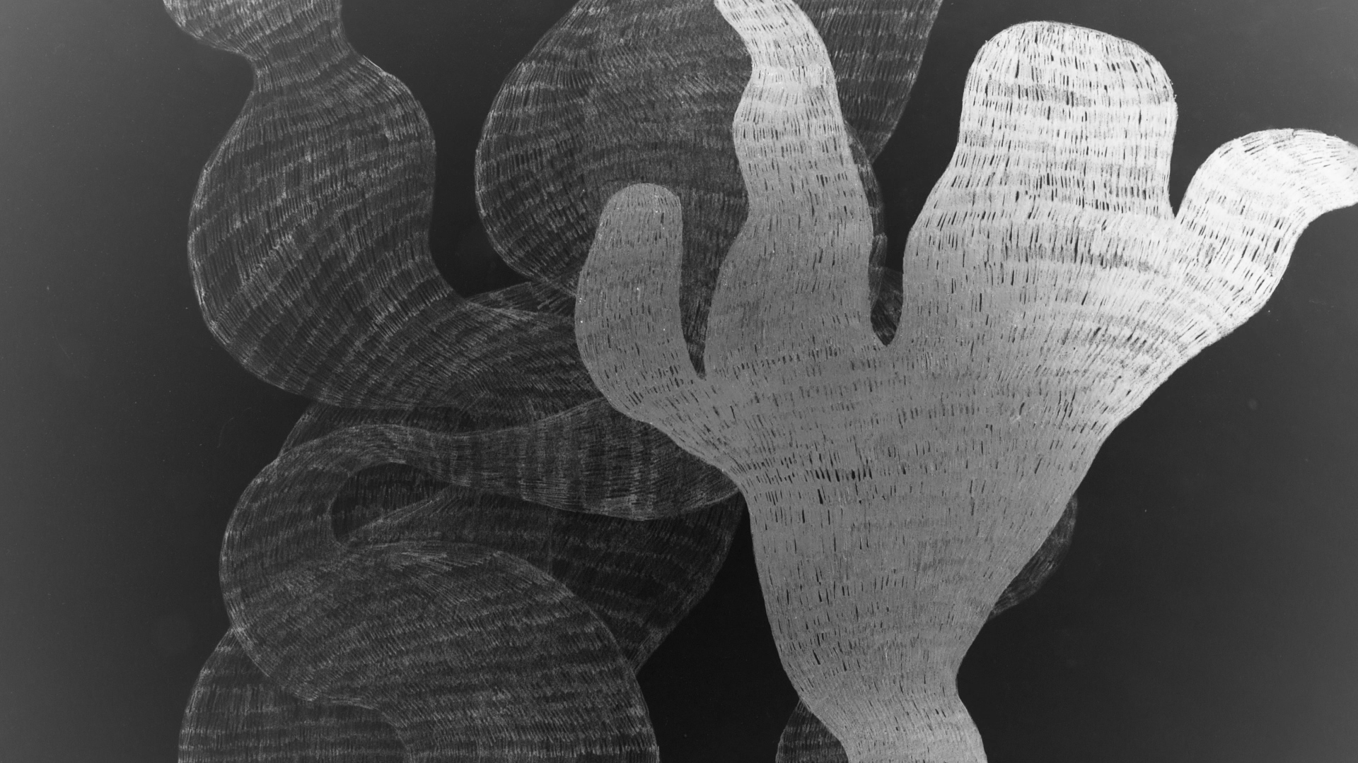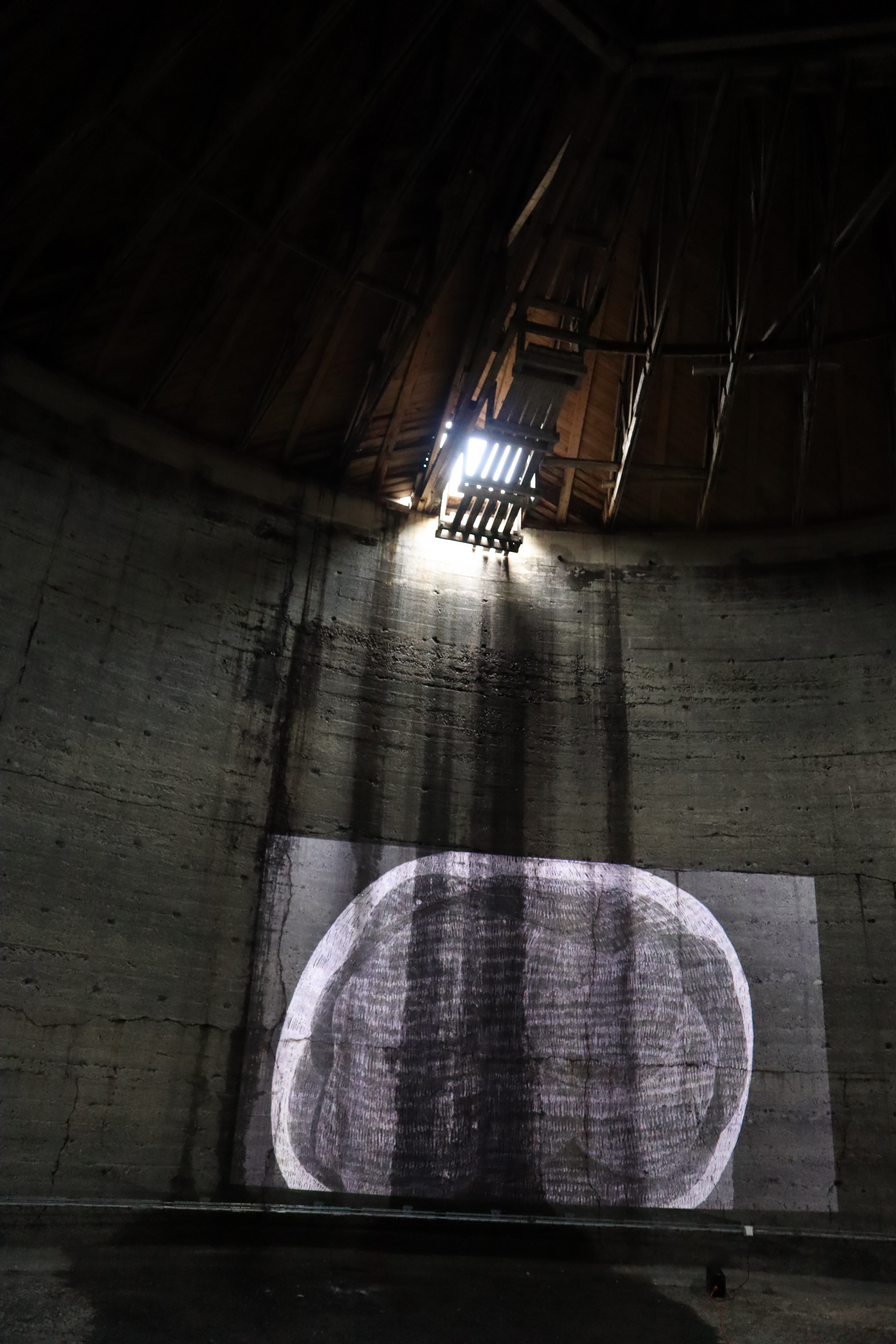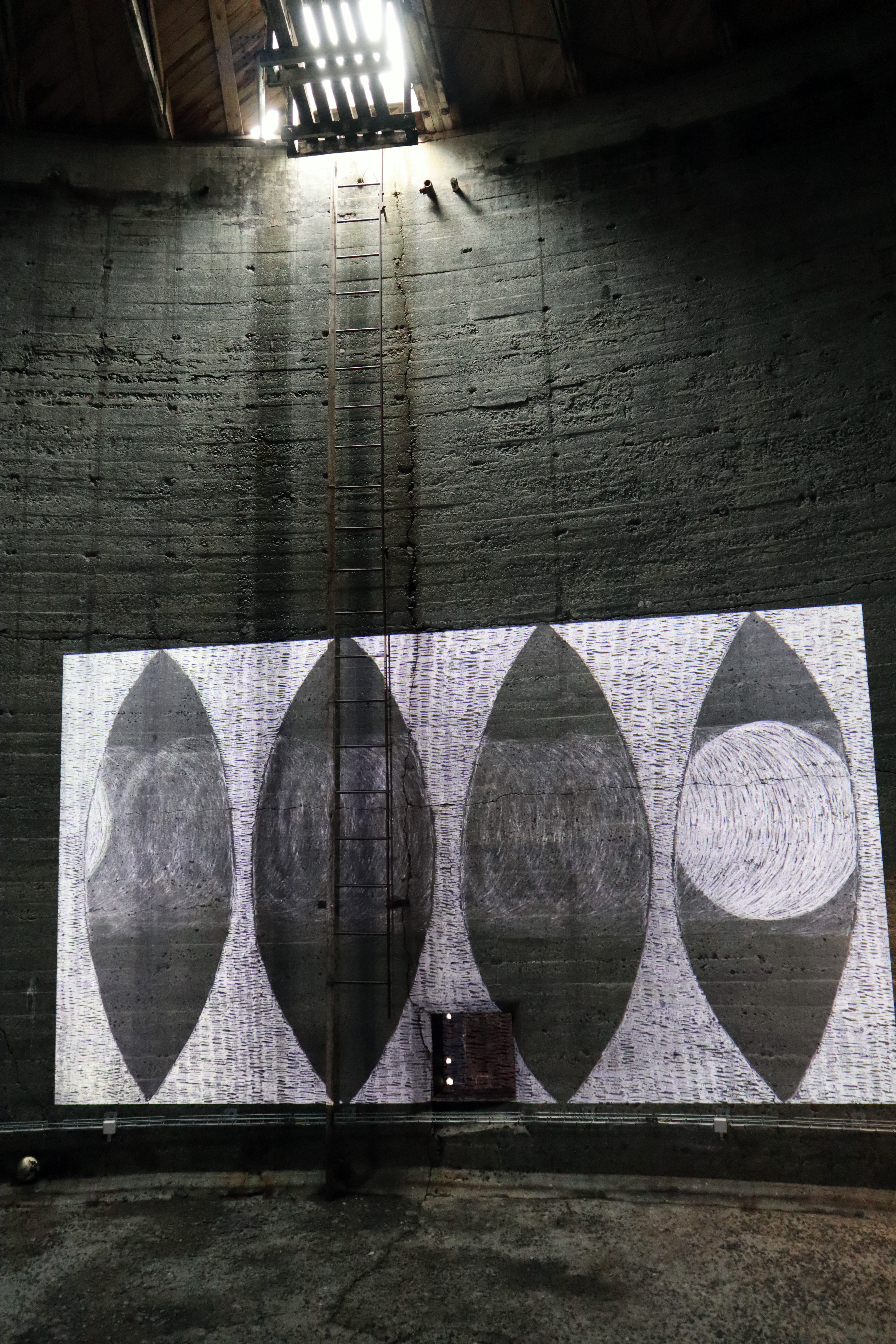 Circular Blackout is a video installation I created in collaboration with the electronic musician Mikael Lind in 2025. Together the video & sound circulate the immense space of the Tanks in Raufarhöfn, like an enormous clock, on a rotating platform. The work consists of 17 hand drawn stop motion videos. With a camera above the drawing table, I record the process of making a drawing, frame by frame, with pencils and coloured pencils on paper.